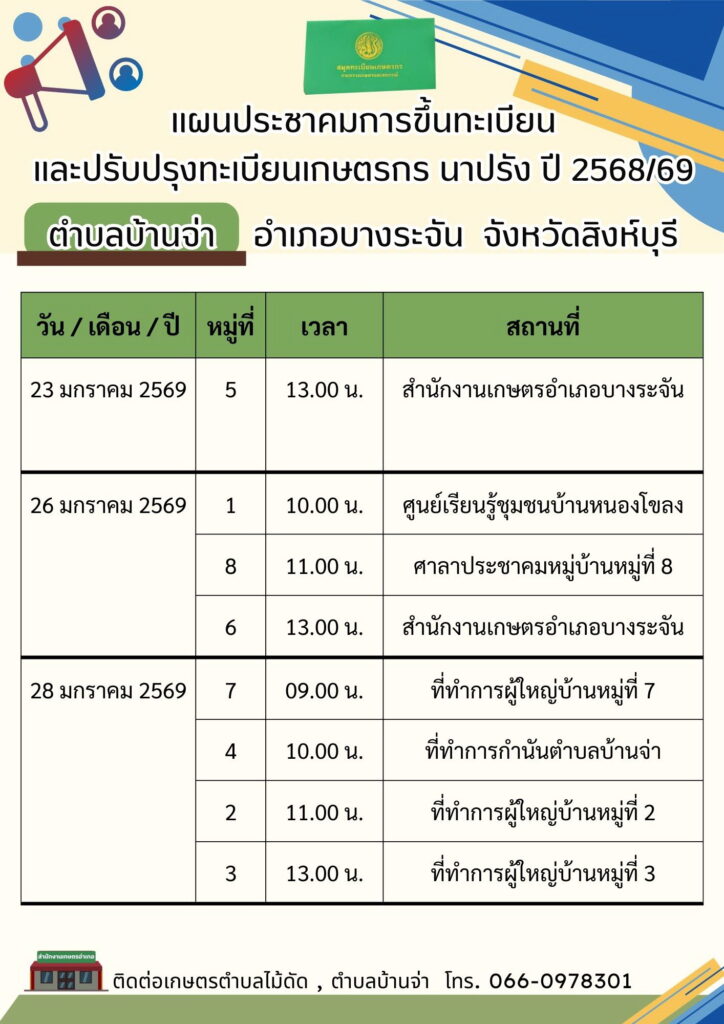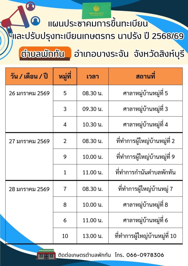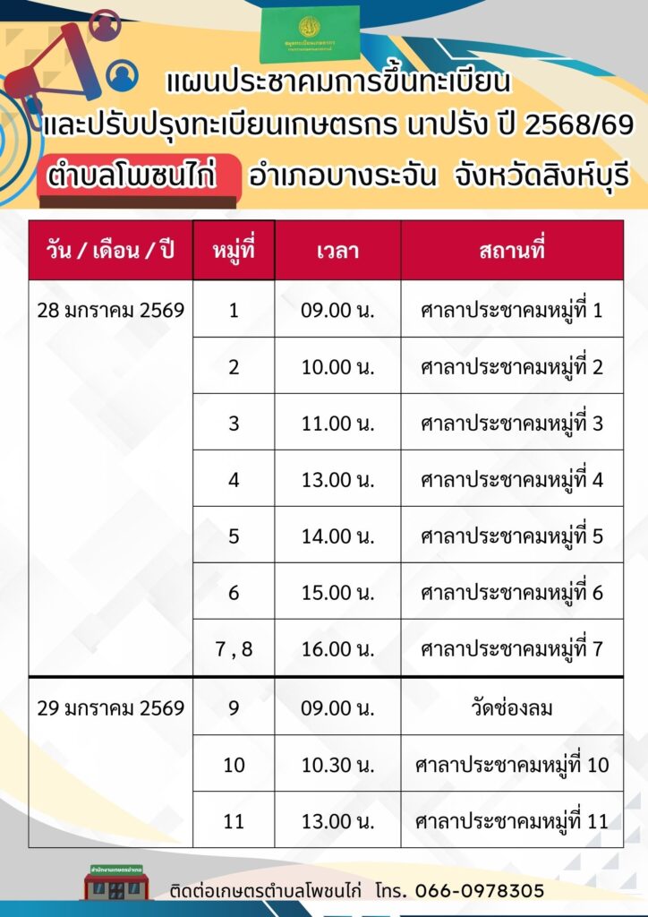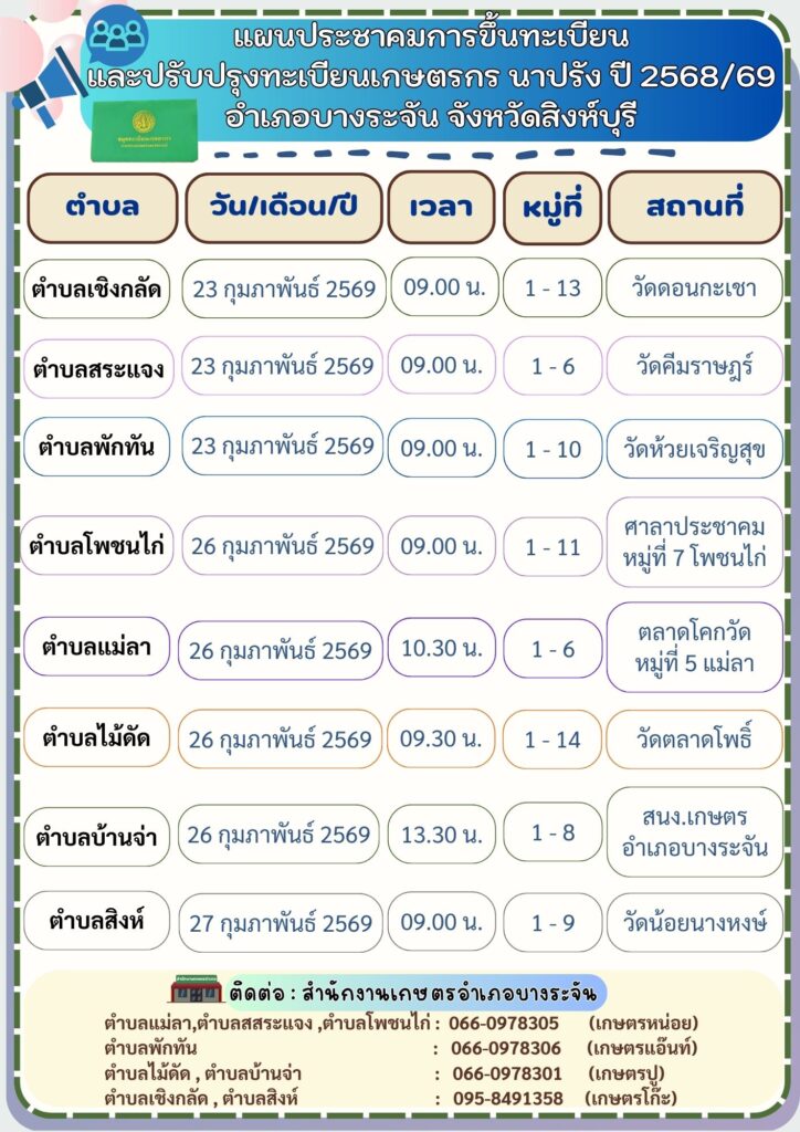 สำนักงานเกษตรอำเภอบางระจัน ลงพื้นที่ดำเนินการประชาคมการขึ้นทะเบียนและปรับปรุงทะเบียนเกษตรกร ปี 2568/69