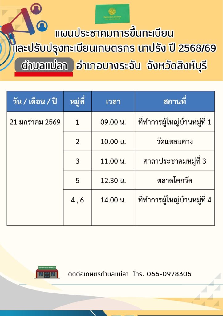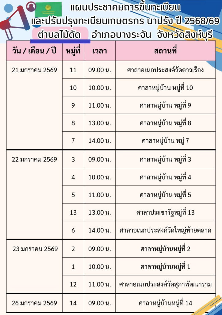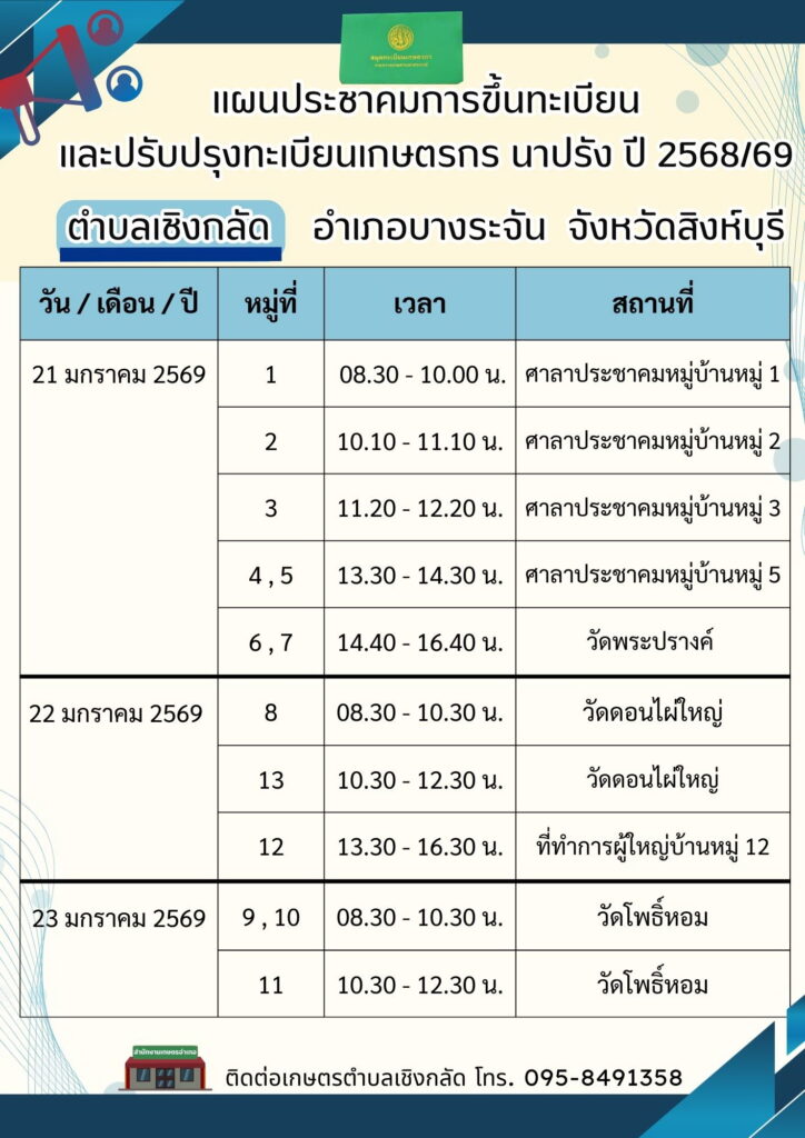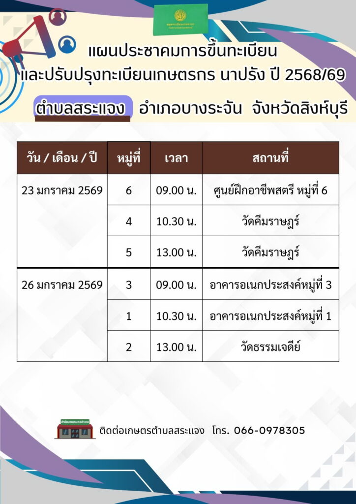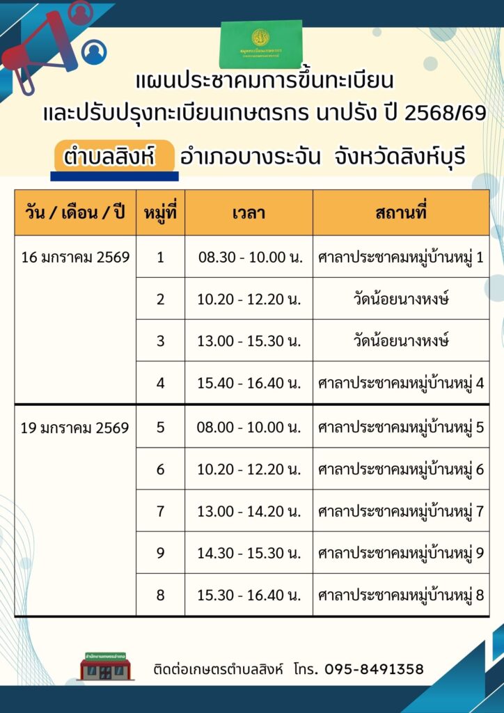 สำนักงานเกษตรอำเภอบางระจัน ลงพื้นที่ดำเนินการประชาคมการขึ้นทะเบียนและปรับปรุงทะเบียนเกษตรกร ปี 2568/69